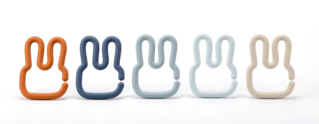 Multi-functional silicone bunny links are ideal for attaching toys and teethers to the stroller, play gym, carrier, or car seat. It comes in a pack of five in an adorable bunny shape. They can be linked together, stacked up, and taken with you wherever you go - helping keep baby's favorite toys off the floor while providing hours of entertainment. They're easy for little hands to hold and explore. Made with 100% food-grade silicone and durable nylon inserts.