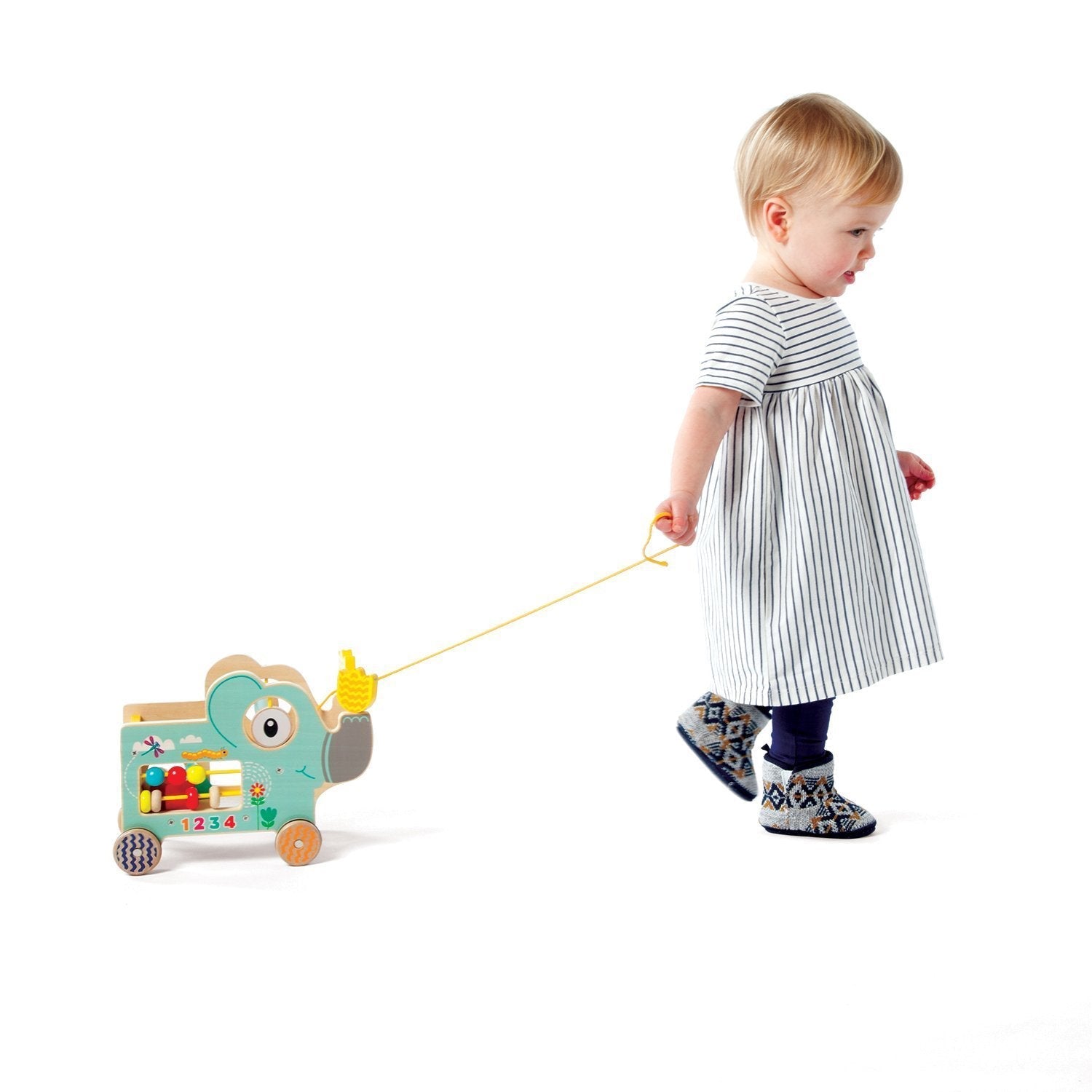 This playful elephant encourages fine motor skills and sensory learning. Features shape sorter and bead run. Elly Elephant pull-toy has rubber-trimmed wheels roll along any flat surface.