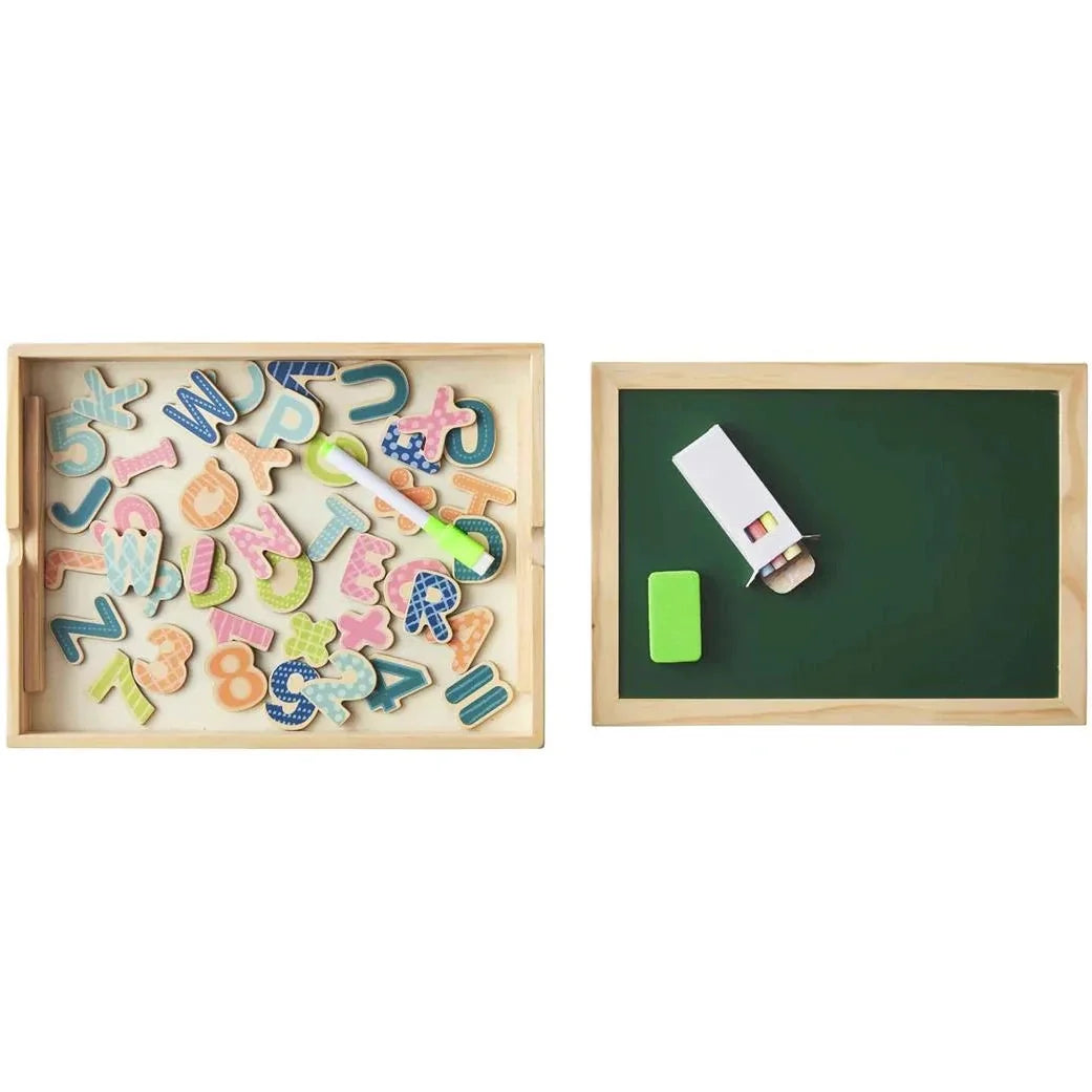 Wooden storage box reverses from chalkboard to whiteboard and holds 42 magnetic letters, numbers and symbols, dry erase marker, chalk and eraser. Ages 3+.