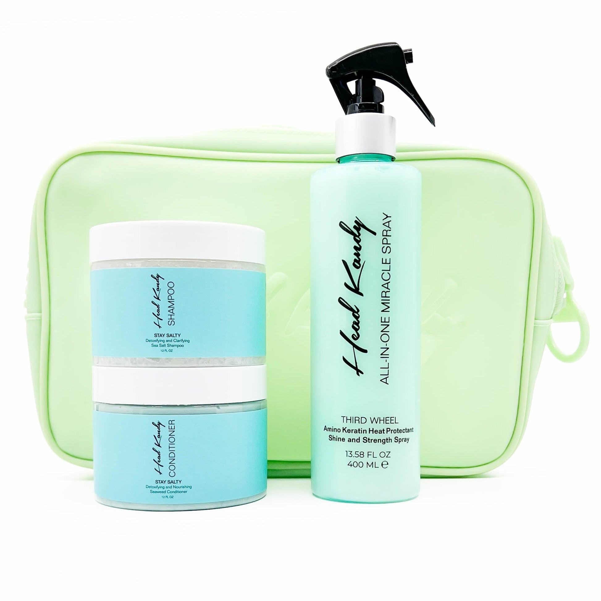 Includes Stay Salty Shampoo and Conditioner, The Third Wheel Miracle Spray, and a matte green Big Mama Bag.