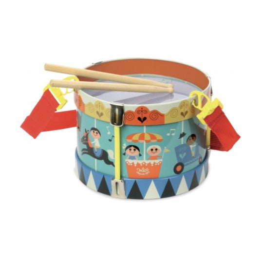 A metal drum to bring everywhere and be ready to play at anytime! It comes with a neck strap, and two wooden drumsticks.
